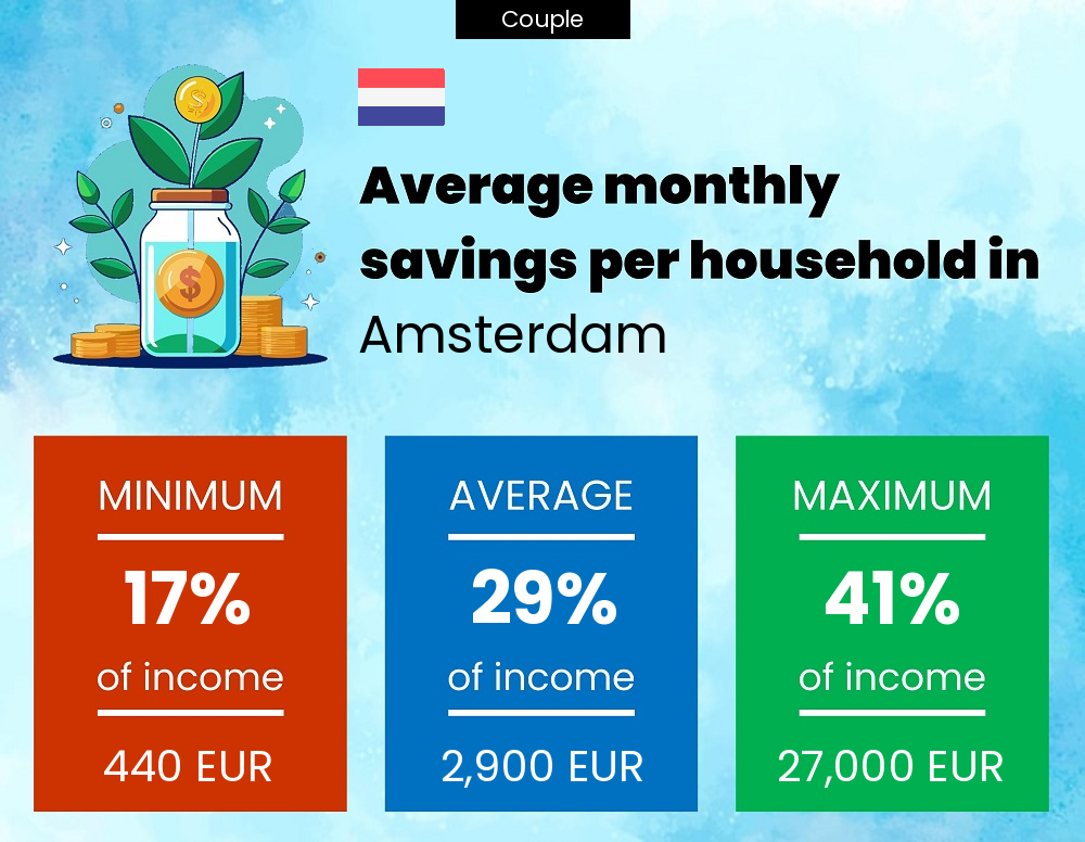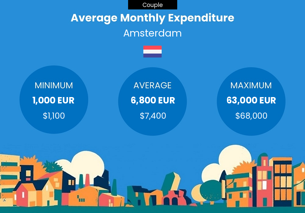 Couples in Amsterdam spend around 6,800 EUR per month on average. Depending on the lifestyle, a couple can survive with a monthly budget as low as 1,000 EUR or as high as 63,000 EUR. Location and income are very important factors and have a huge influence on expenditure and budget.