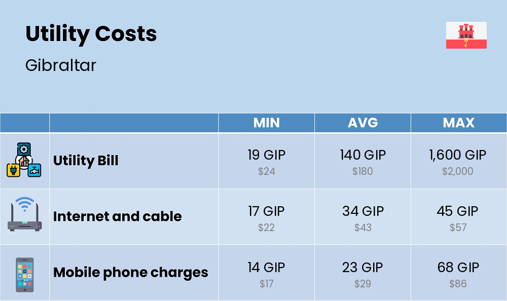 Energy, electricity, water, gas, internet, and mobile cost in Gibraltar