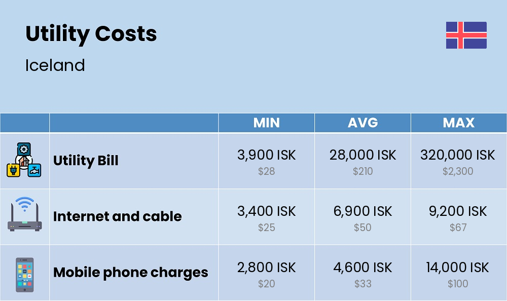 Energy, electricity, water, gas, internet, and mobile cost in Iceland