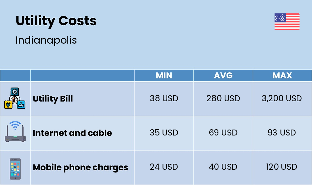 Energy, electricity, water, gas, internet, and mobile cost in Indianapolis