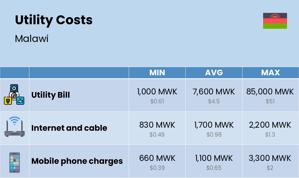 Energy, electricity, water, gas, internet, and mobile cost in Malawi